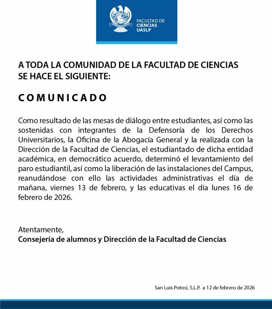 Los estudiantes de la Facultad de Ciencias de la Universidad Autónoma de San Luis Potosí (UASLP), levantaron el paro estudiantil iniciado desde el pasado martes, pero regresaran a clases hasta el próximo lunes 16 de febrero.