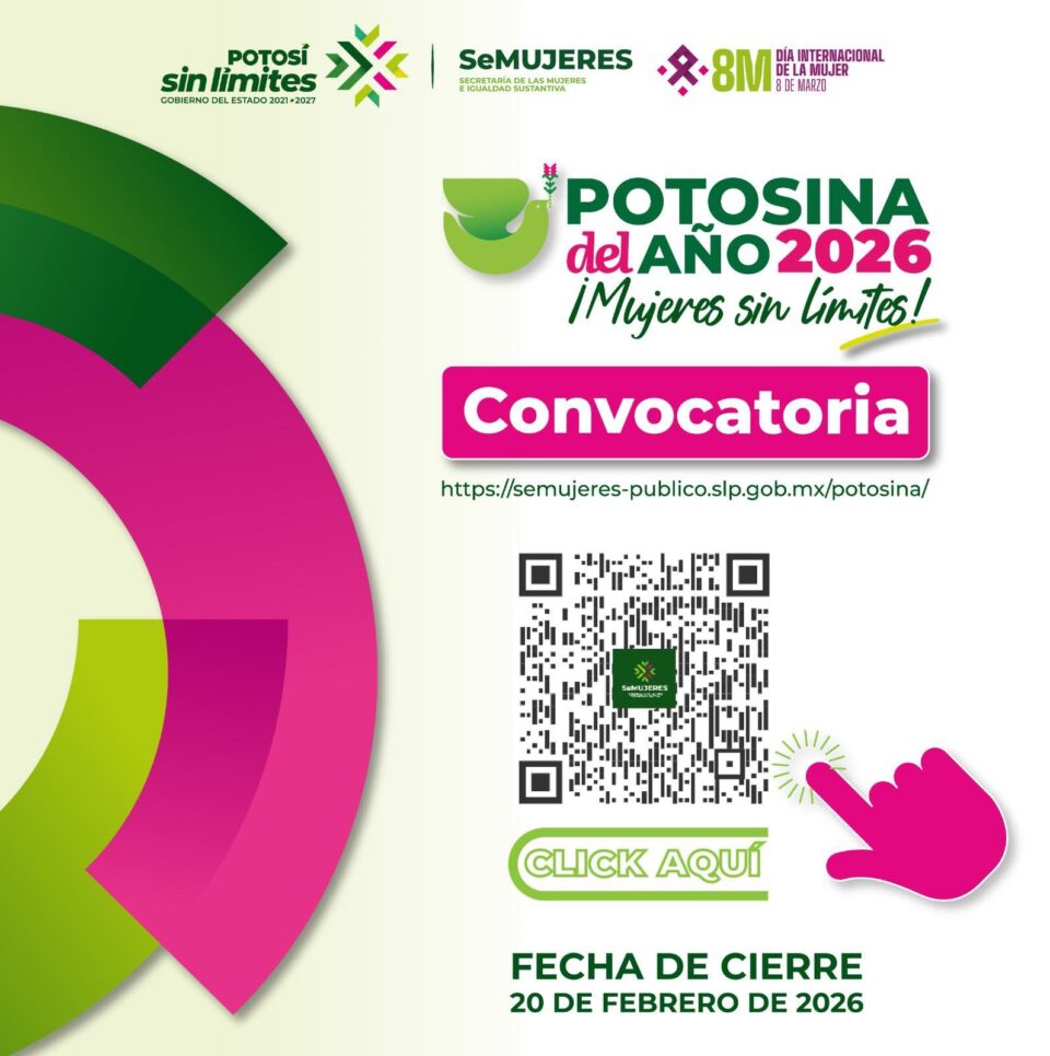 La Secretaría de las Mujeres e Igualdad Sustantiva mantiene abierta la convocatoria del certamen “Potosina del Año 2026”, cuyo registro de postulaciones estará disponible hasta el viernes 20 de febrero.