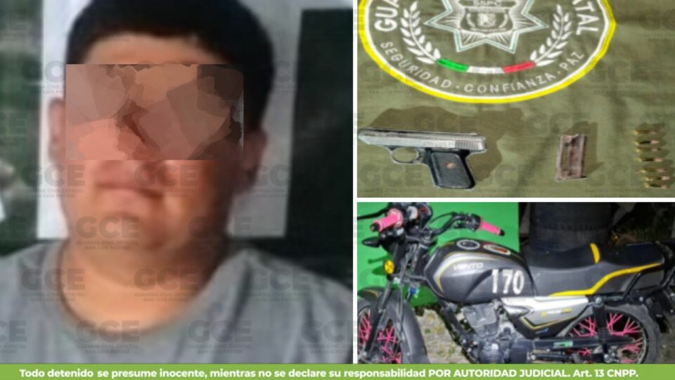 El detenido fue identificado como Eduardo “N”, a quien se le aseguró un arma de fuego calibre .22 milímetros, un cargador, siete cartuchos útiles y una motocicleta marca Vento, modelo 2026.