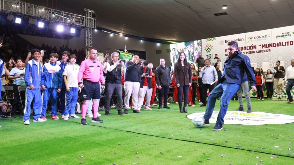 El gobernador de San Luis Potosí, Ricardo Gallardo Cardona, inauguró el Mundialito Escolar 2026, torneo en el que participarán más de 90 mil estudiantes de educación básica y media superior rumbo al Mundial de Futbol 2026. Durante el arranque del evento, el mandatario y el titular de la Conade, Rommel Pacheco, cobraron el penalti inicial.