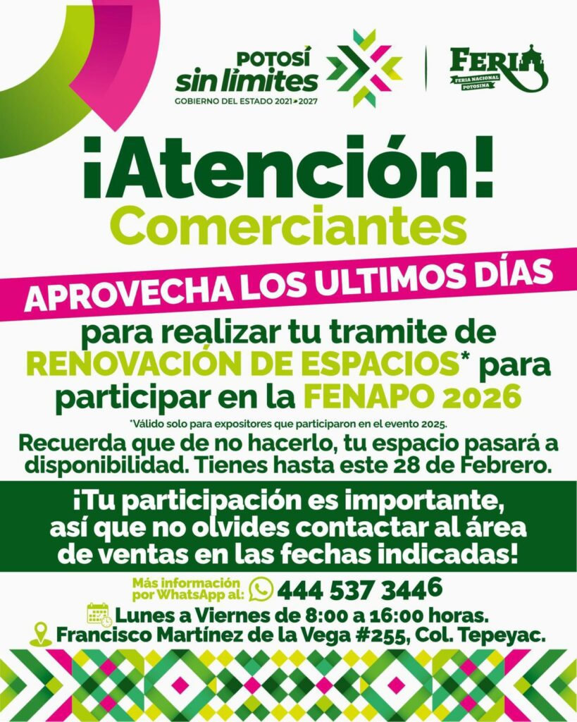 El Patronato de la Feria Nacional Potosina (Fenapo), informó que las y los comerciantes que participaron en 2025 deberán realizar su trámite de renovación antes del 28 de febrero para garantizar su espacio en la edición 2026.