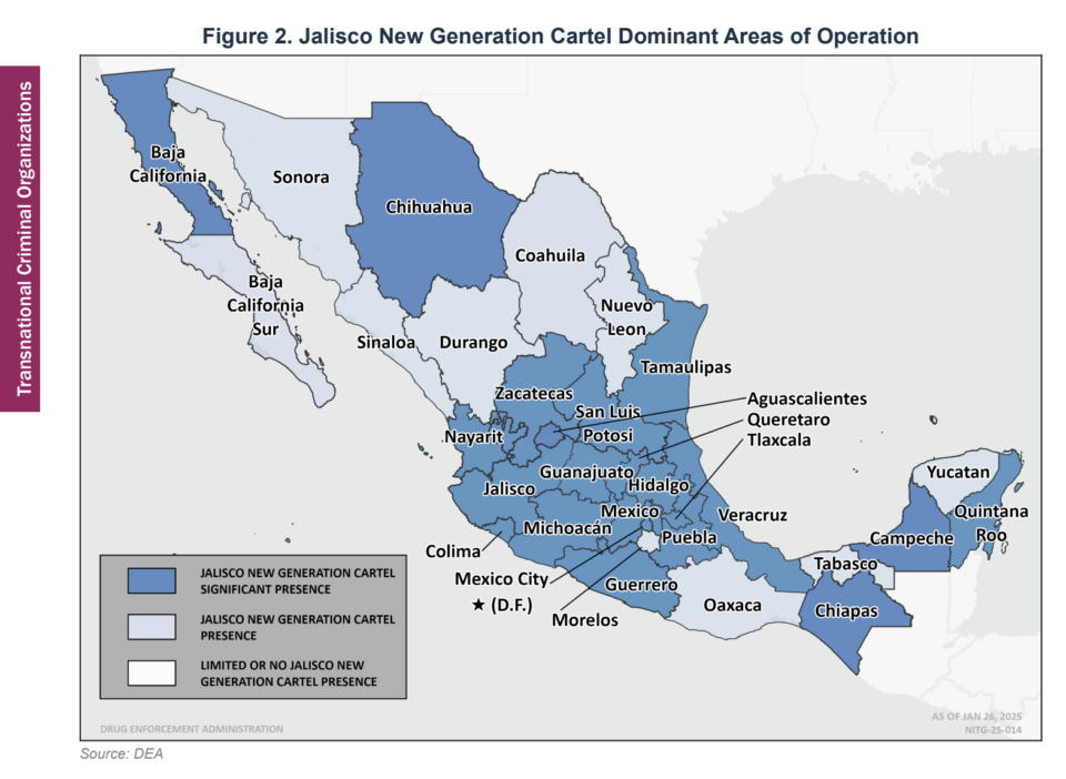 El Cártel Jalisco Nueva Generación (CJNG) es identificado por autoridades estadounidenses como una de las organizaciones criminales más poderosas e influyentes de México y uno de los principales proveedores de drogas ilícitas hacia Estados Unidos. De acuerdo con el informe 2025 National Drug Threat Assessment de la Administración para el Control de Drogas (DEA, por sus siglas en inglés), el grupo ha extendido sus operaciones más allá del territorio mexicano y mantiene presencia en más de 40 países. El documento señala que la organización se apoya en amplios recursos financieros, una estructura criminal de tipo franquicia, altos niveles de violencia y acceso a funcionarios corruptos para consolidar y ampliar su influencia dentro del mercado ilícito de drogas.
