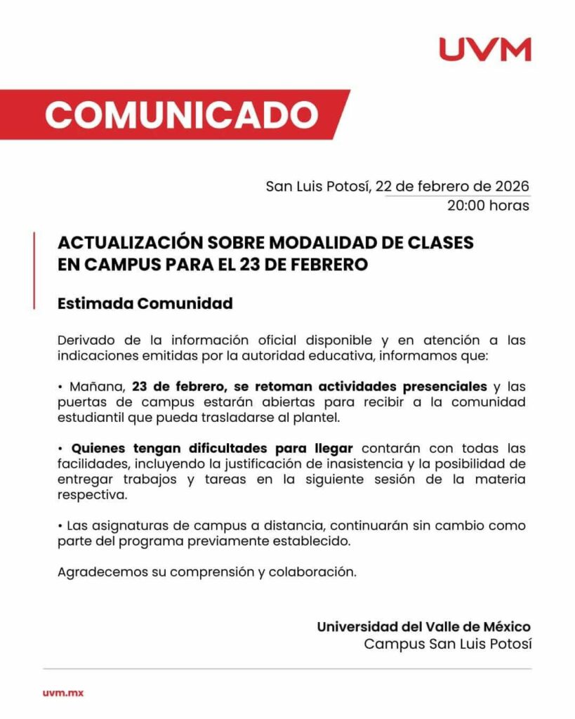 Minutos después, la Universidad Autónoma de San Luis Potosí (UASLP), anunció que, se otorgarán facilidades académicas por motivos de seguridad o ubicación geográfica, sin repercusiones académicas por inasistencias.