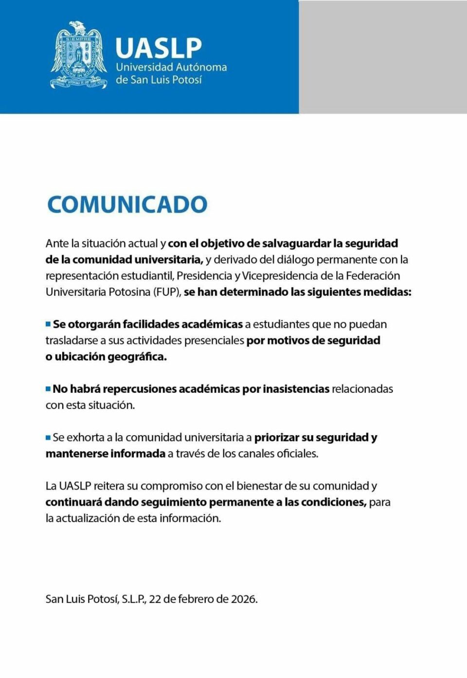 Minutos después, la Universidad Autónoma de San Luis Potosí (UASLP), anunció que, se otorgarán facilidades académicas por motivos de seguridad o ubicación geográfica, sin repercusiones académicas por inasistencias.