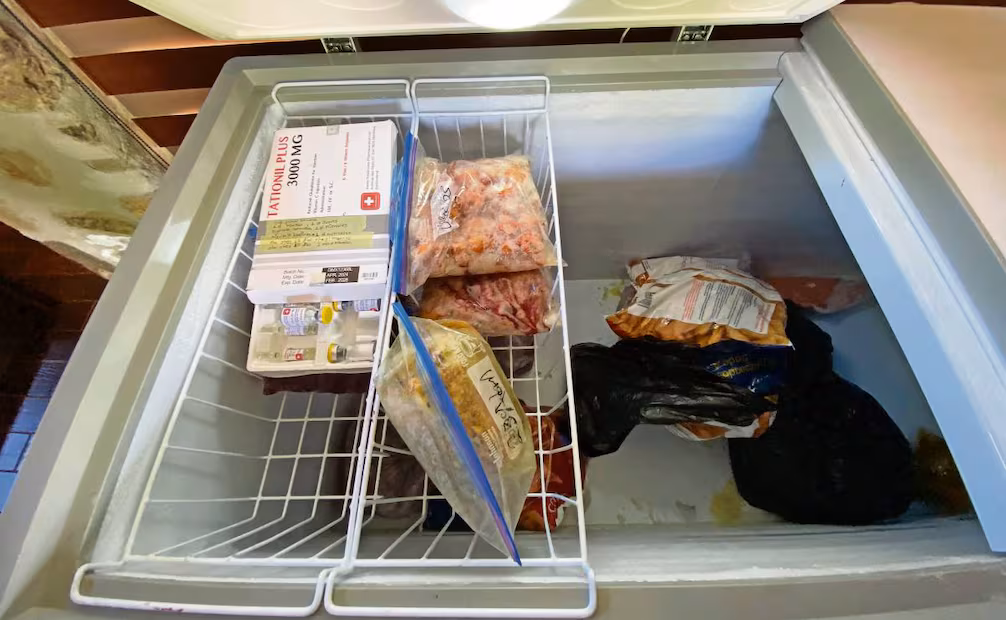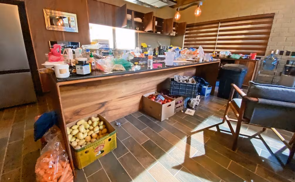 La entrada principal está compuesta por una cocina y comedor, en los que había una gran cantidad de alimentos, principalmente frutas y verduras, así como un refrigerador en cuyo interior hay cortes de carne y pescado. El Mencho padecía insuficiencia renal y se encontró un medicamento denominado Tationil Plus, que se utiliza como agente terapéutico complementario para esta enfermedad.